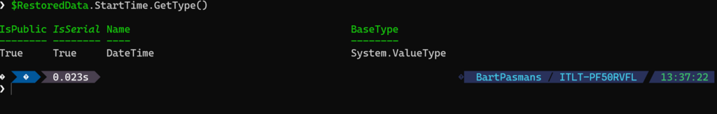 💡 Note: Type Fidelity. If you check $RestoredData.StartTime.GetType(), you’ll see it’s still a System.DateTime. If you had used ConvertTo-Json, it would have turned into a boring System.String. That is the power of CliXml, it immediately puts variables in the correct type!