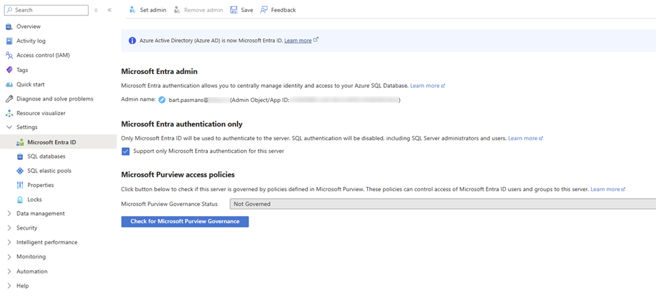 πŸ“’ This step enables Azure AD authentication on the SQL Server. Without this, the server won’t accept Azure AD tokens, only SQL authentication!