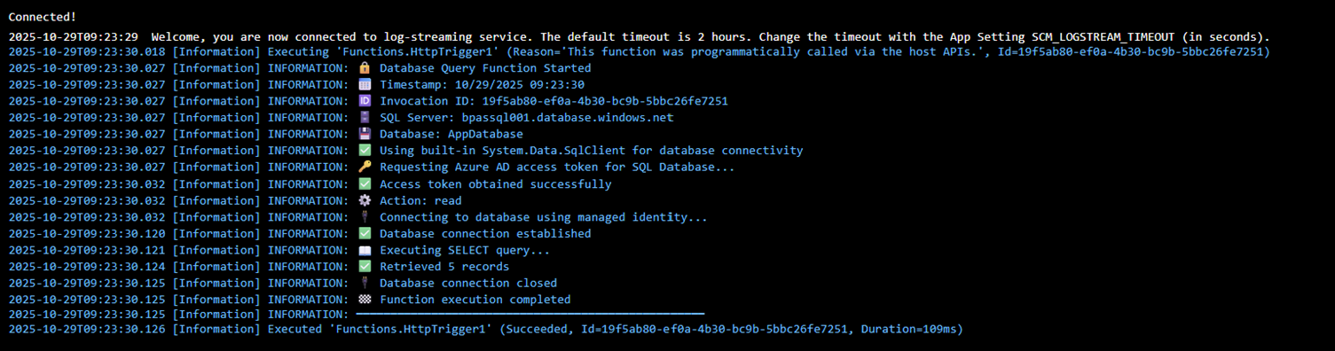 I hope this inspires you to implement managed identity in your own projects. Maybe next time you’ll add retry logic, connection pooling, or even integrate with Azure Key Vault for additional secrets!