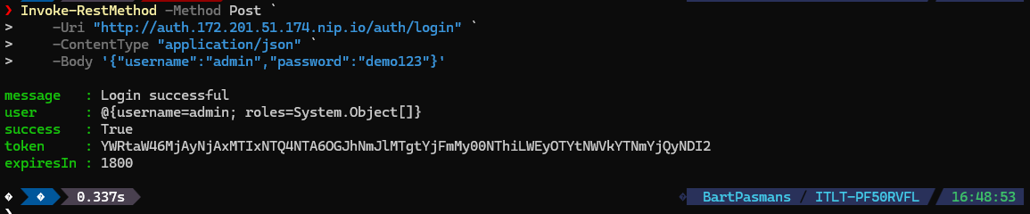 $login = Invoke-RestMethod -Method Post -Uri "http://auth.172.201.51.174.nip.io/auth/login" -ContentType "application/json" -Body '{"username":"admin","password":"demo123"}'