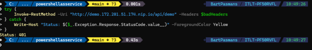Write-Host "Status: $($_.Exception.Response.StatusCode.value__)" -ForegroundColor Yellow