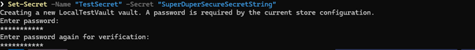 Set-Secret -Name "TestSecret" -Secret "SuperDuperSecureSecretString"