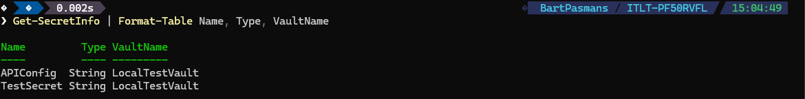 📦 Retrieved them easily using Get-Secret, both as secure strings and plain text.