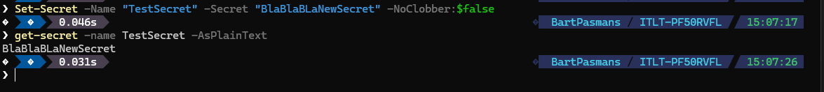 Set-Secret -Name "TestSecret" -Secret "BlaBlaBLaNewSecret" -NoClobber:$false