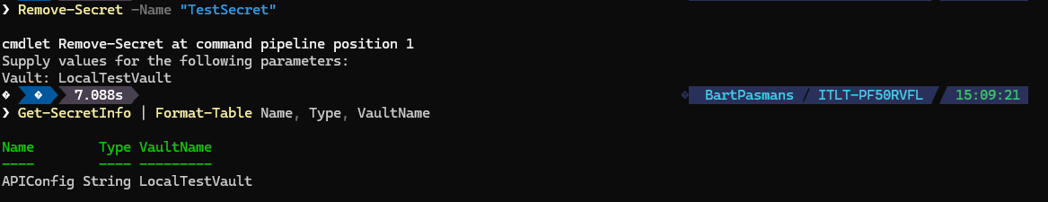 Remove-Secret -Name "TestSecret”