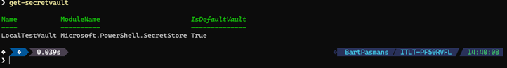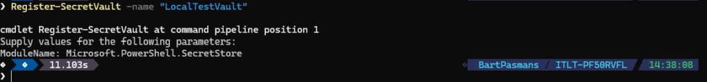 It will ask you for the module. Enter the name “Microsoft.PowerShell.SecretStore”. (If you want you can also specify this value directly in the CMDLet by specifying the -ModuleName parameter.
