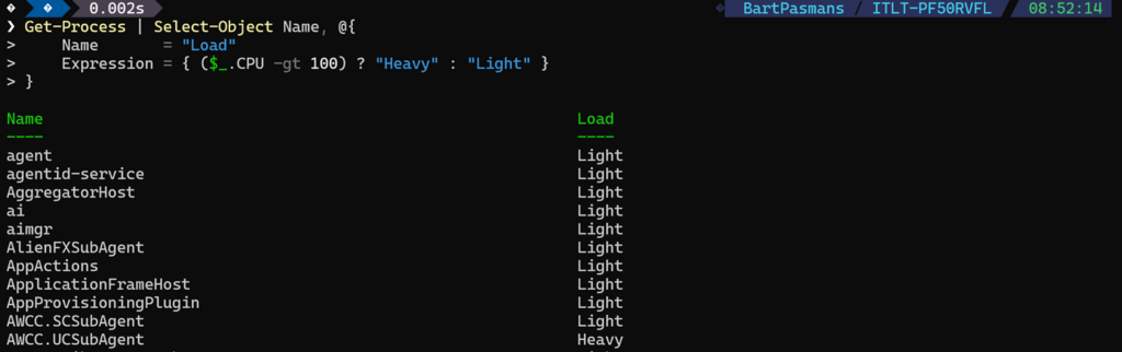 Expression = { ($_.CPU -gt 100) ? "Heavy" : "Light" }